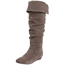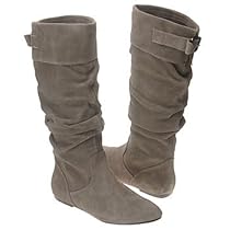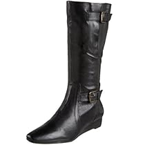 I have this boot in Black suede and it's a really cute wedge boot. The wedge is about 1 inch so is really comfortable for walking. I have medium calves and they fit well. The shoe is true to size. The only thing is that if the shaft was taller they'd look even better. They are slightly taller than mid-calf. Even so it looks cute with dresses and stockings and should fit skinny jeans if I adjust the buckles.